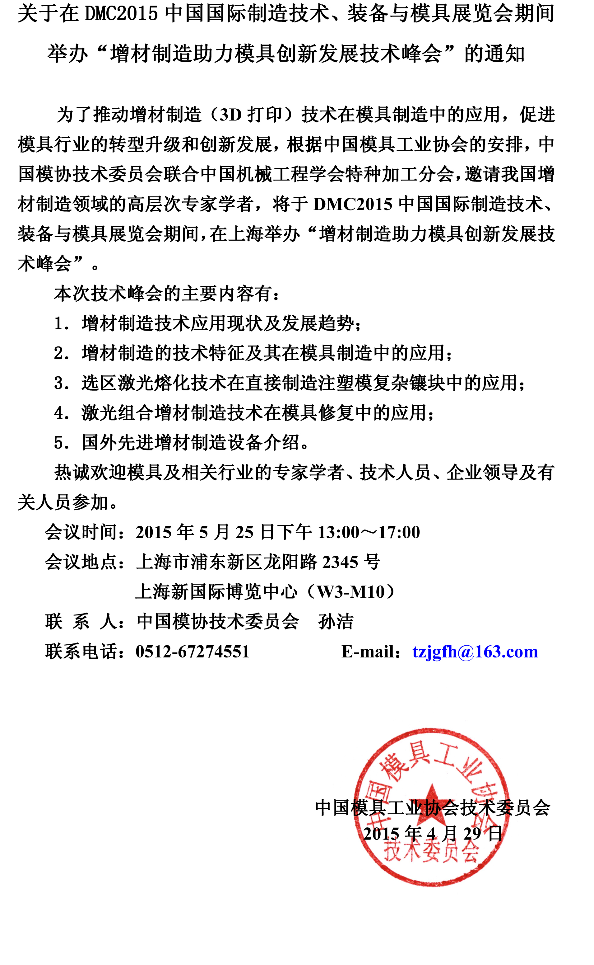 關(guān)于在DMC2015中國(guó)國(guó)際制造技術(shù)、裝備與模具展覽會(huì)期間舉辦“增材制造助力模具創(chuàng)新發(fā)展技術(shù)峰會(huì)”的通知