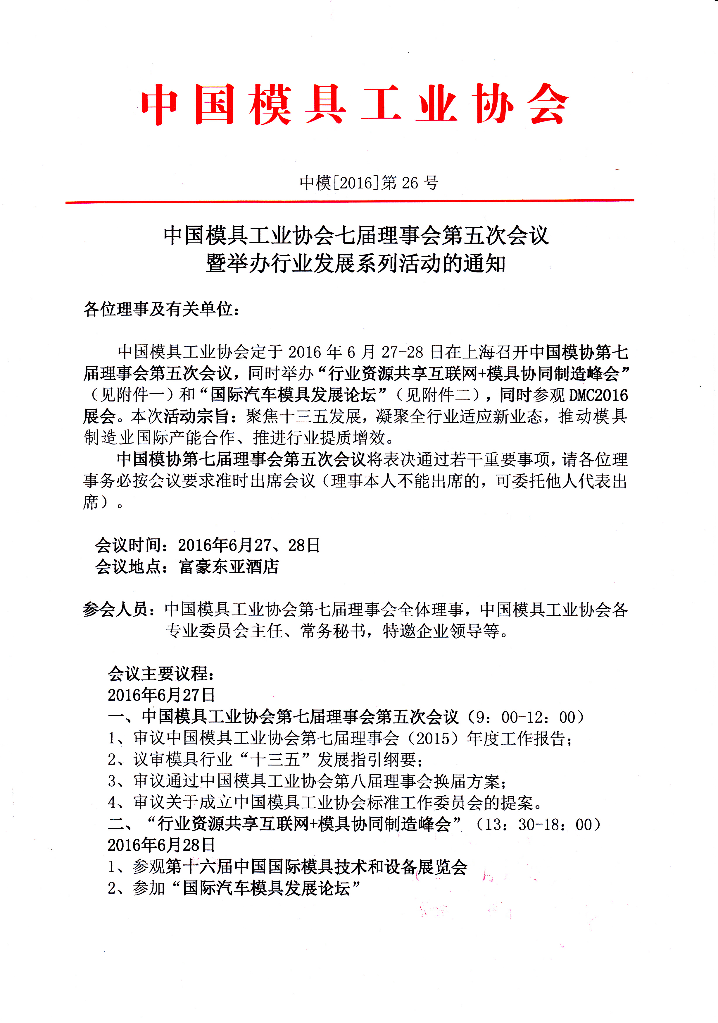 中國模具工業協會七屆理事會第五次會議暨舉辦行業發展系列活動的通知