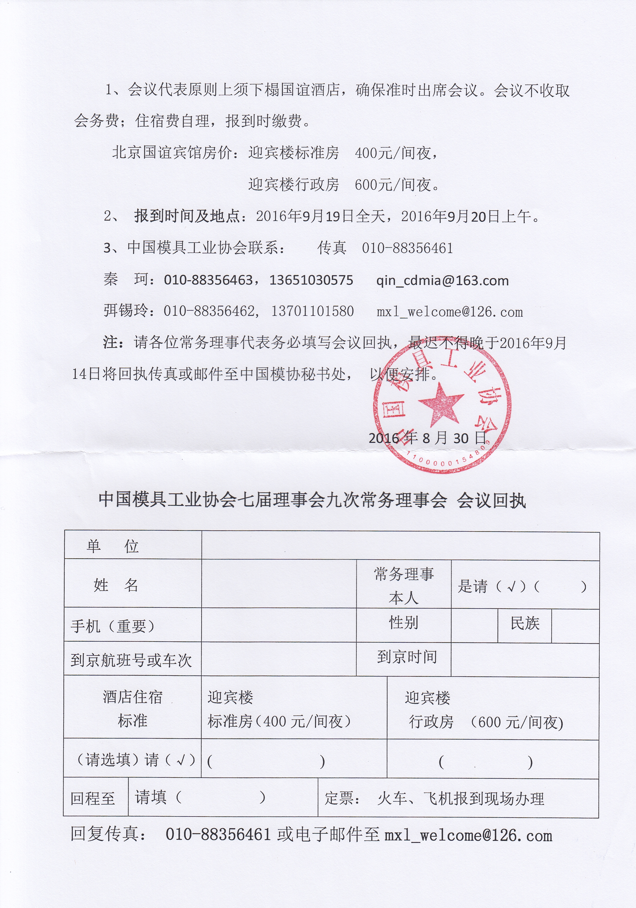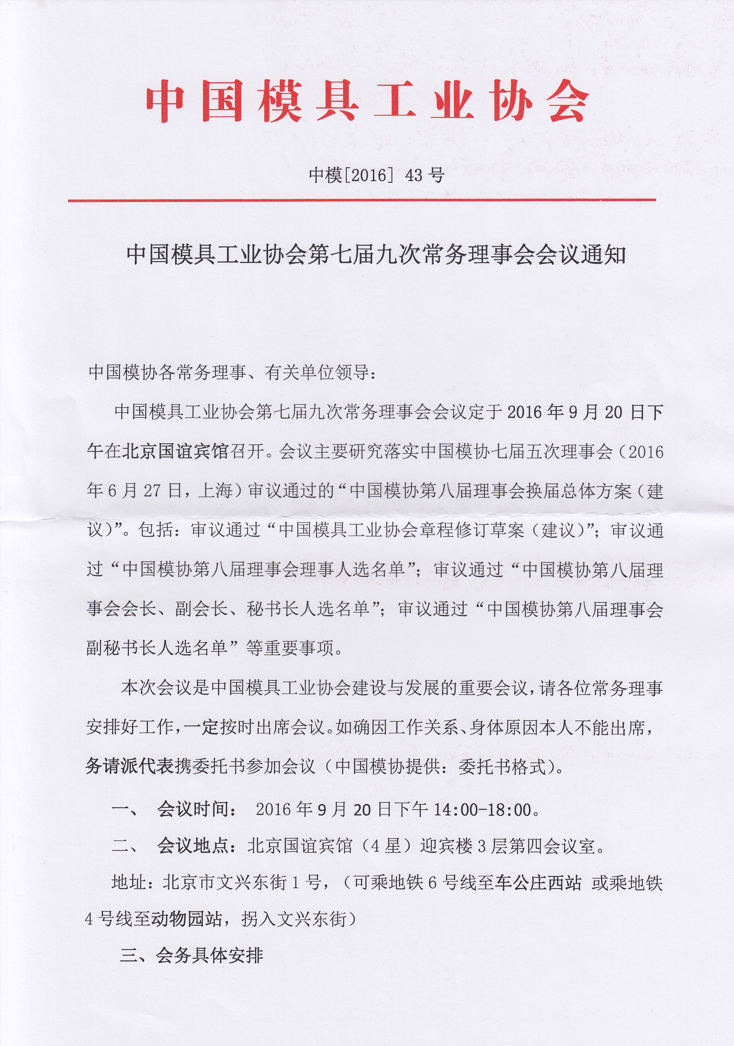 中國模具工業(yè)協(xié)會(huì)第七屆九次常務(wù)理事會(huì)會(huì)議通知
