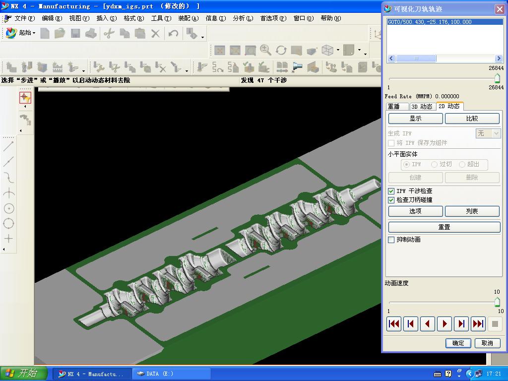 數控程序的編制應盡量使刀具承受載荷均勻,避免刀具走刀方向的突然變化,避免因局部過切而造成刀具的損壞。通過數控編程程序補償機床CAM系統能根據加工瞬時余量的大小,自動對進給率進行優化處理,可減少刀具損壞。在加工方法上采用層銑深度優先,這樣可降低抬刀次數;刀具進刀采用斜插入,避免刀具突然承受巨大載荷而造成刀具的損壞。盡量減少刀具的急速換向,同時考慮加工不同階段采用不同程序。粗加工中的修圓和光弧連接功能都應去掉,這樣可減少重復刀路,提高效率。對數控粗加工程序刀路及數控程序模擬效果進行模擬分析(見圖三),確認數控程序刀路的可靠性,分析得出無過切及刀具碰撞現象。在優化程序時盡量考慮加工余量徑向大于軸向,主要是考慮到走刀時,如果刀具發生斷刀現象,徑向比軸向更容易扎刀。