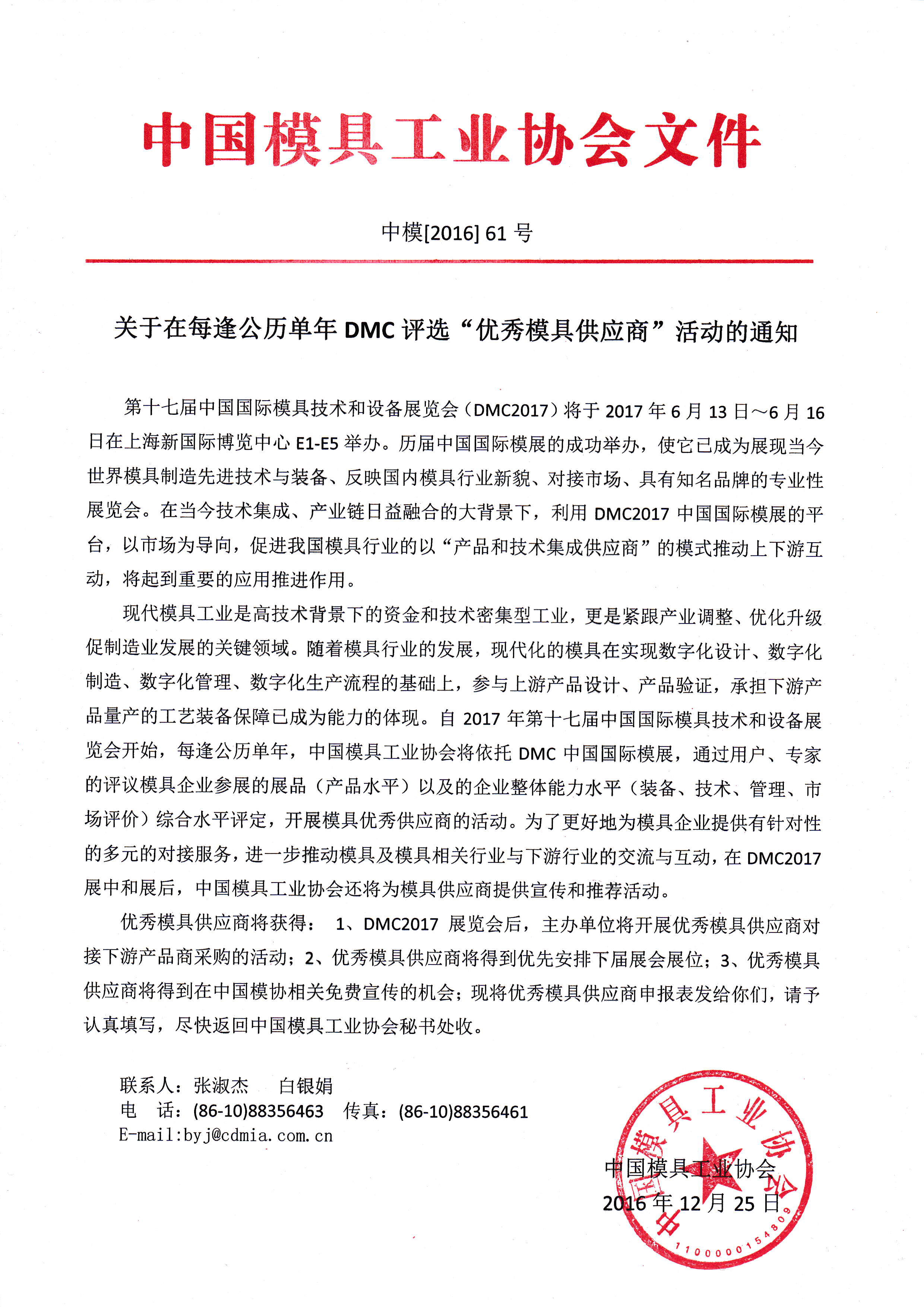 關(guān)于在每逢公歷單年DMC評選“優(yōu)秀模具供應(yīng)商”活動的通知