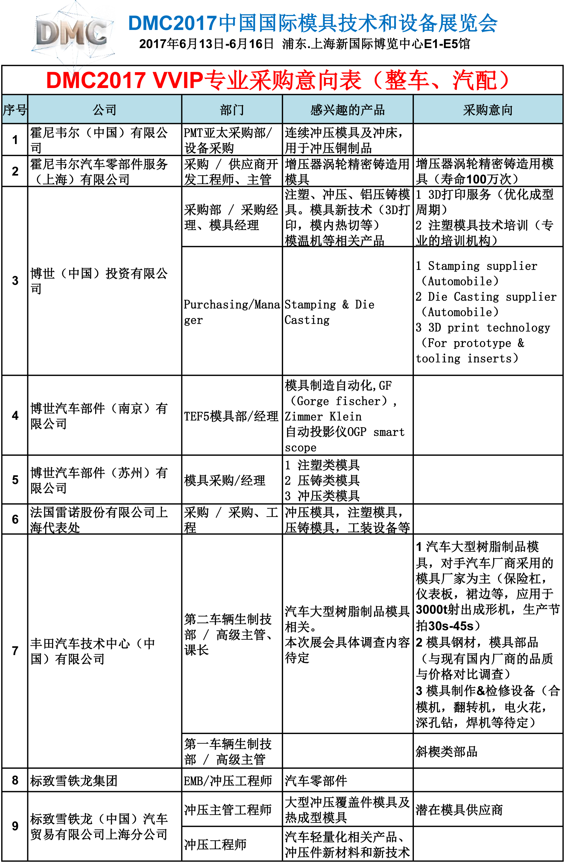 DMC2017 VVIP專業采購意向表(整車、汽配)