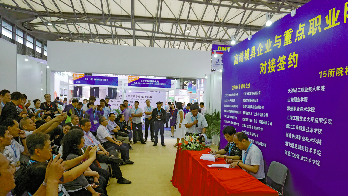 DMC2017開展當天, 13家模具企業(天津汽車模具股份有限公司、寧海金輝模塑有限公司、昆山嘉華電子有限公司、珠海市精模有限公司、昆山德盛精密模具有限公司、瑞鵠汽車模具股份有限公司、上海賽科利汽車模具技術應用有限公司、天澤精密技術(上海)有限公司、億森(上海)模具有限公司、優德精密工業(昆山)股份有限公司、北汽興東方模具(北京)有限公司、寧波方正汽車模具有限公司、廣東星聯精密機械有限公司、河北安迪模具有限公司、江蘇榮騰精密組件科技股份有限公司、昆山匯美塑膠模具工業有限公司)與中國模具工業協會職業院校教育委員會的14所高等職業院校(天津輕工職業技術學院、長春汽車工業高等專科學校、西安航空職業技術學院、滁州職業技術學院、江蘇信息職業技術學院、上海工程技術大學高職學院、寧波職業技術學院、浙江工商職業技術學院、廣州番禺職業技術學院、福建信息職業技術學院、武漢城市職業學院、淮安信息職業技術學院、安徽國防科技職業技術學院、湖北工業職業技術學院)進行了面對面的深入的交流,彼此了解了院校的專業設置和畢業生走向以及企業的需求,并在“權責分明、資源共享、優勢互補、平等互利、共同發展”的框架下,形成了戰略合作意見。