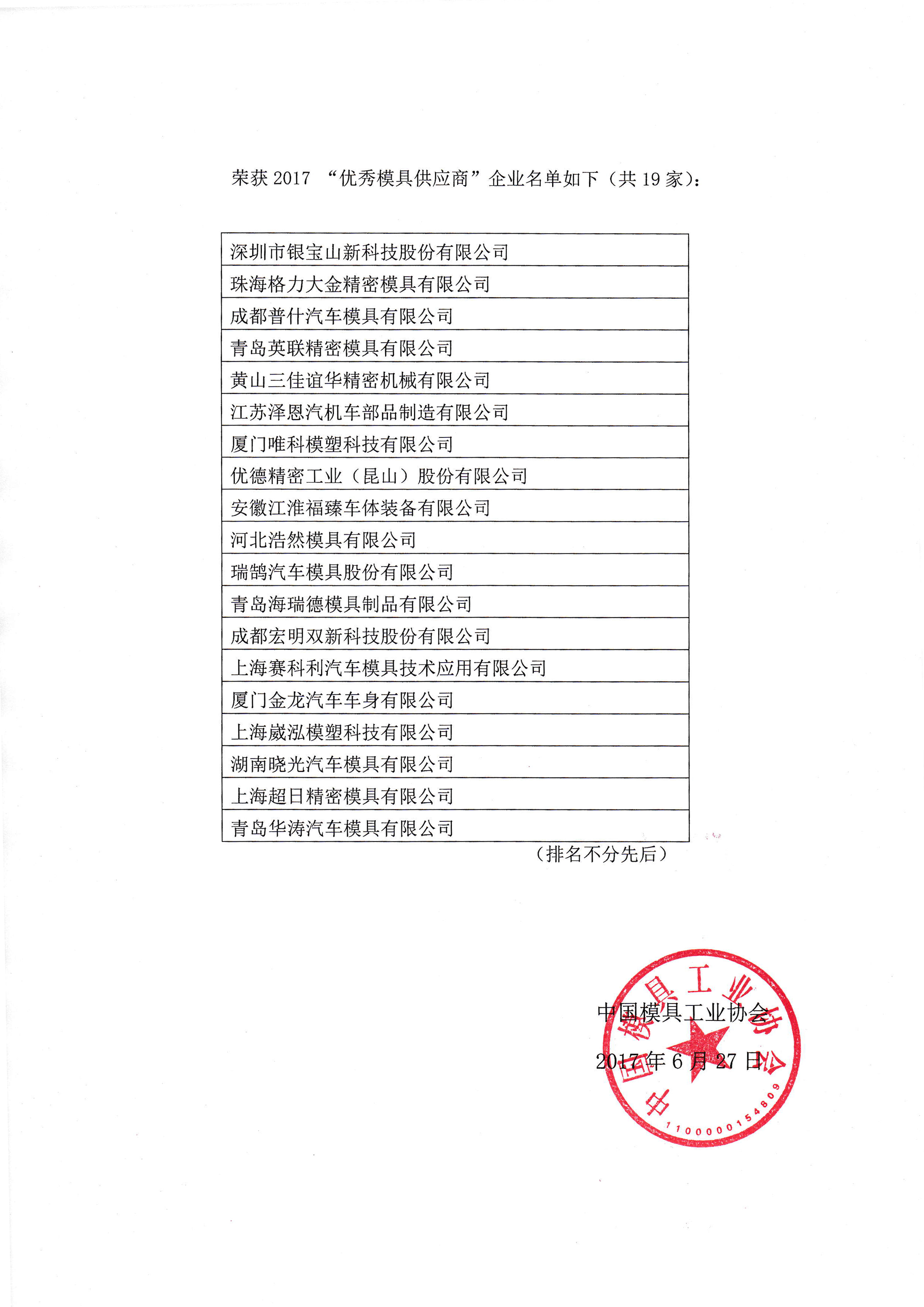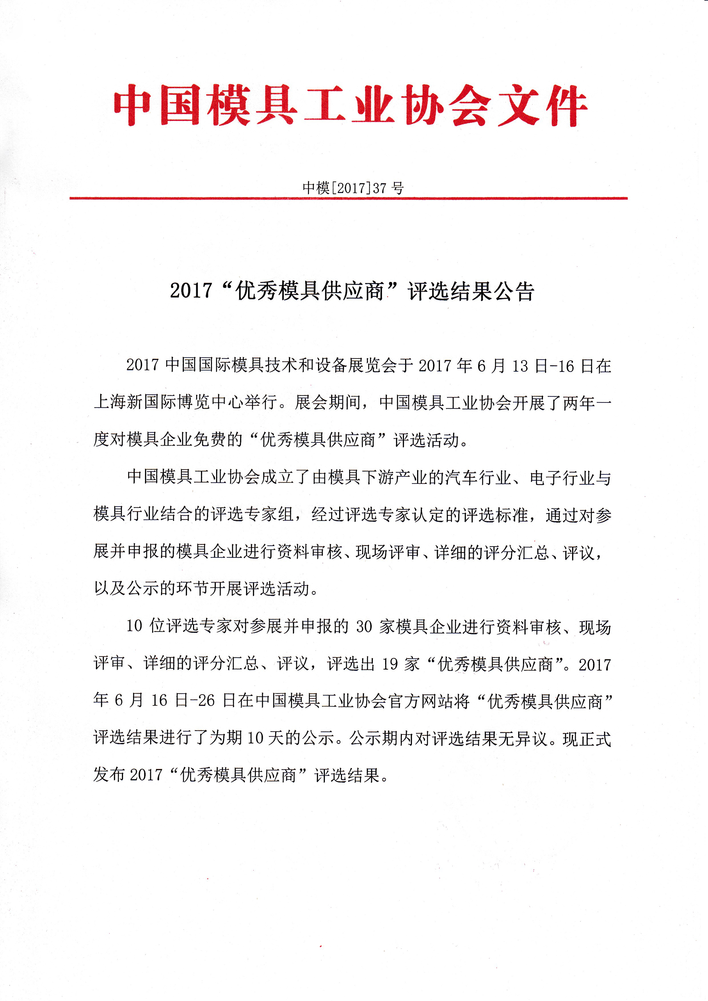 2017“優秀模具供應商”評選結果公告