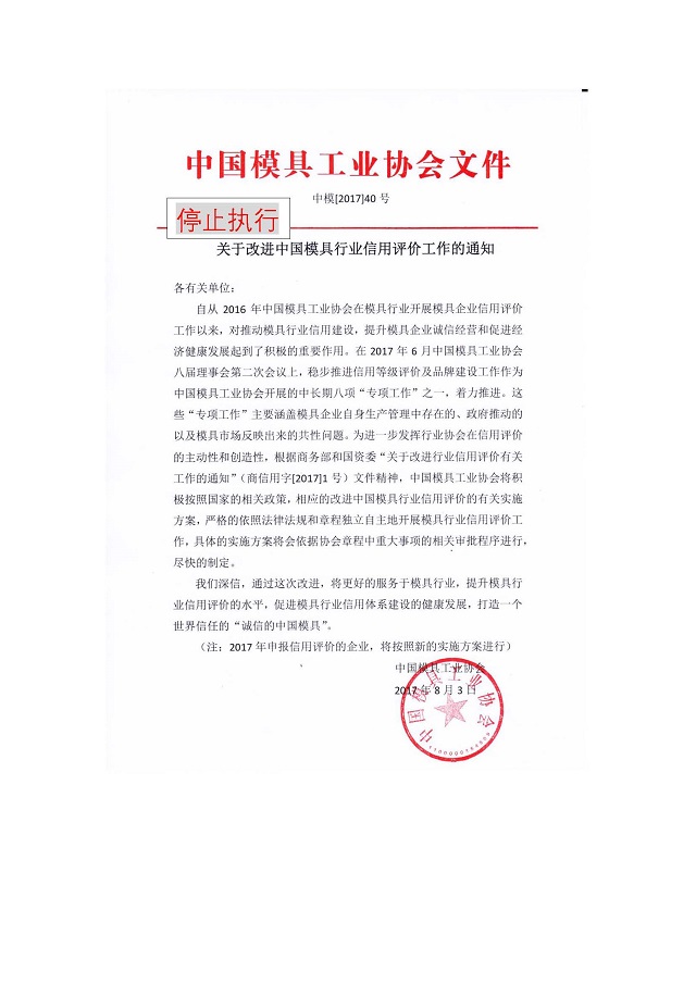 關(guān)于改進(jìn)中國(guó)模具行業(yè)信用評(píng)價(jià)工作的通知