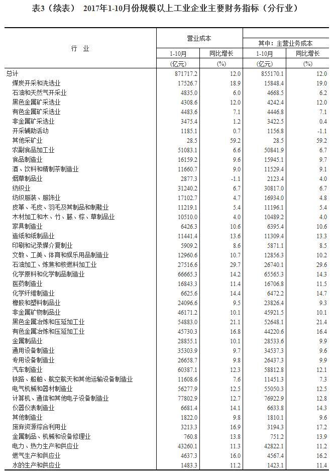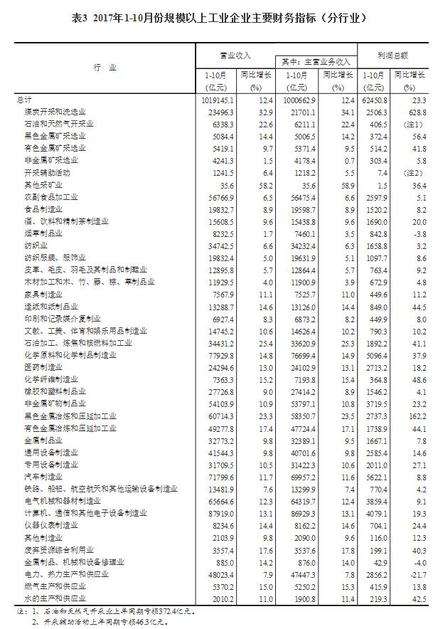 1-10月份,在41個工業大類行業中,38個行業利潤總額同比增加,3個行業減少。主要行業利潤情況如下:煤炭開采和洗選業利潤總額同比增長6.3倍,農副食品加工業增長5.1%,紡織業增長3.2%,石油加工、煉焦和核燃料加工業增長41.1%,化學原料和化學制品制造業增長37.9%,非金屬礦物制品業增長23.2%,黑色金屬冶煉和壓延加工業增長1.6倍,有色金屬冶煉和壓延加工業增長44.1%,通用設備制造業增長14.6%,專用設備制造業增長27.1%,汽車制造業增長8.8%,電氣機械和器材制造業增長9.1%,計算機、通信和其他電子設備制造業增長19.3%,石油和天然氣開采業由同期虧損轉為盈利,電力、熱力生產和供應業利潤總額同比下降21.7%。