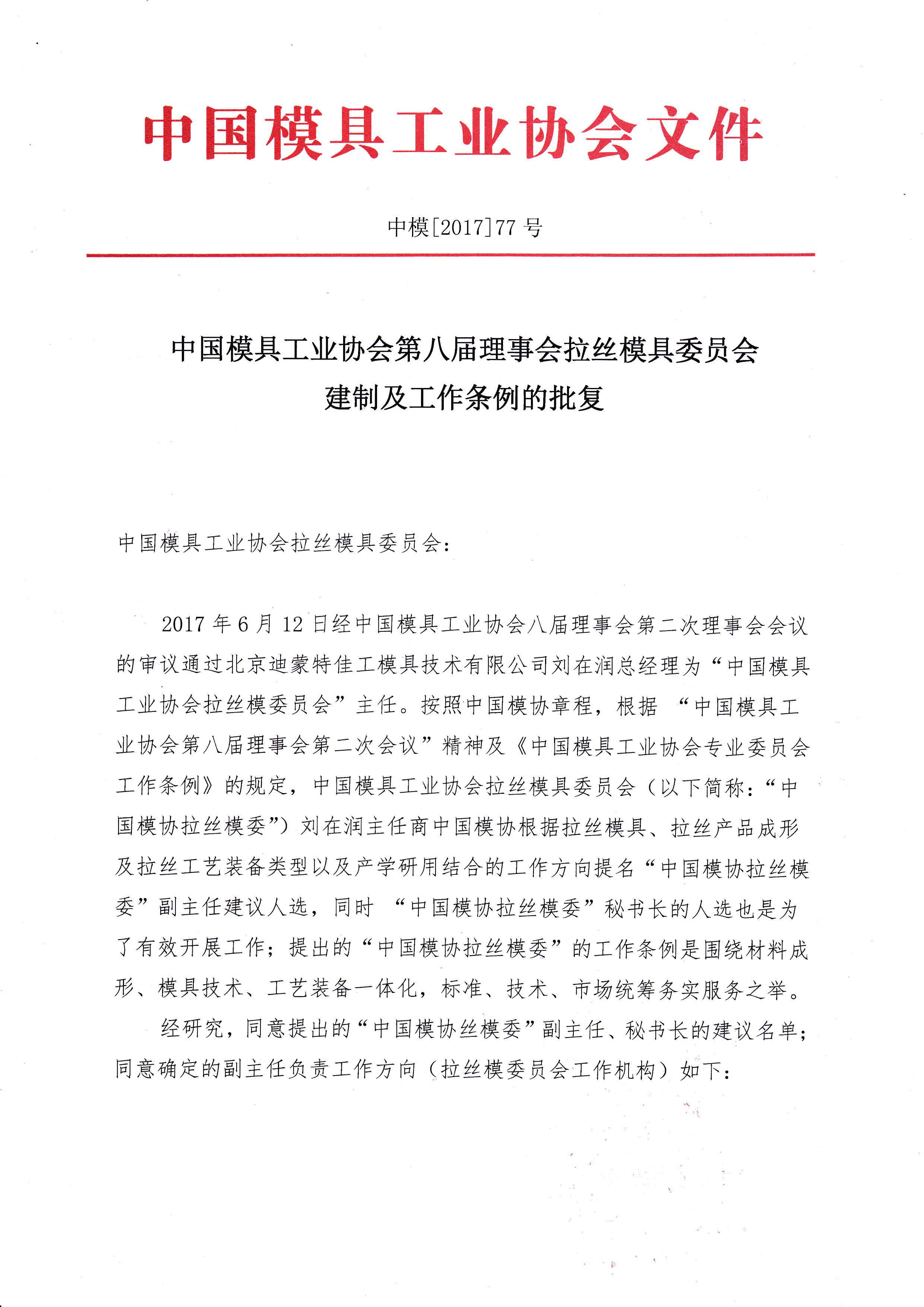 中國模具工業協會第八屆理事會拉絲模具委員會建制及工作條例的批復