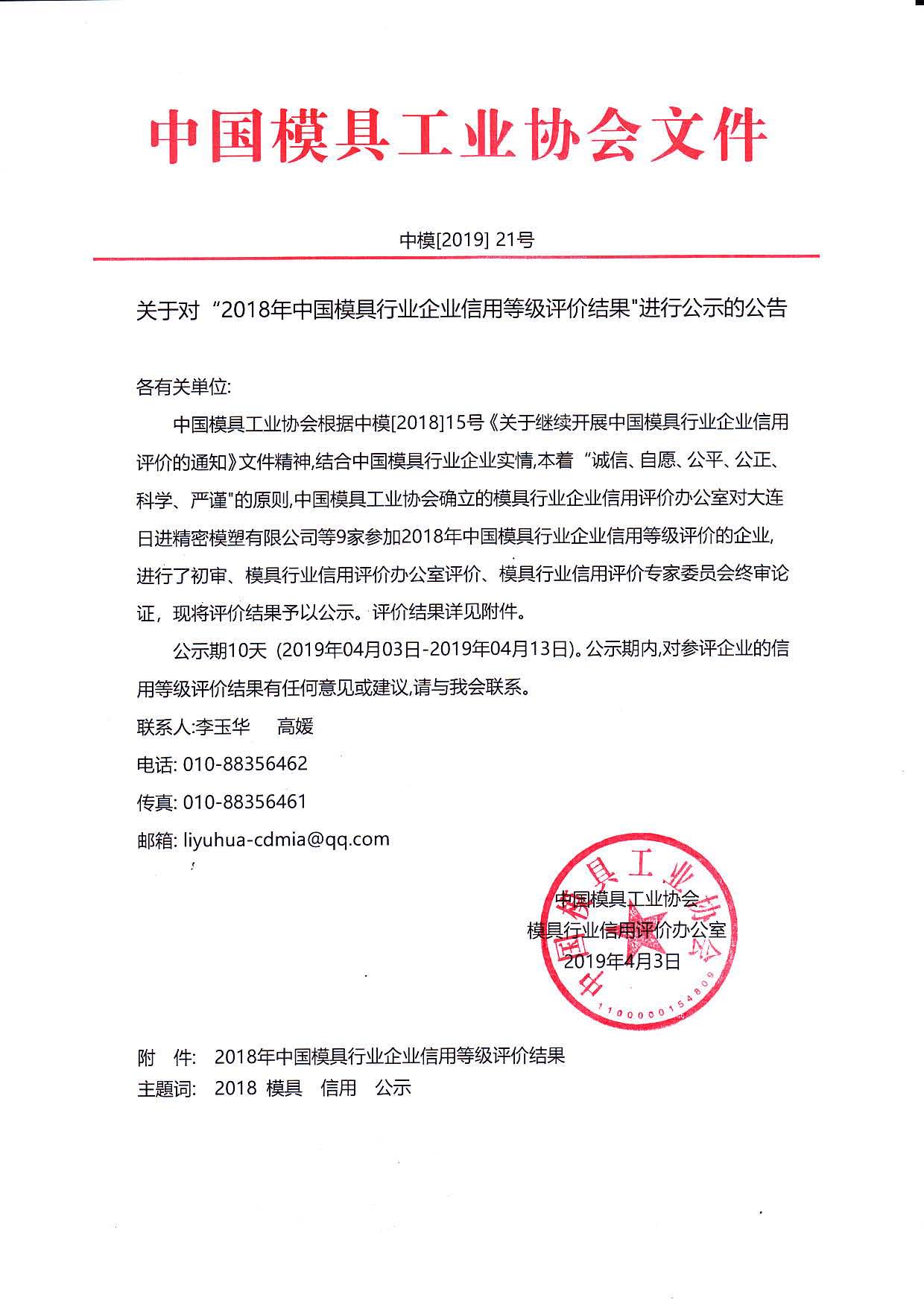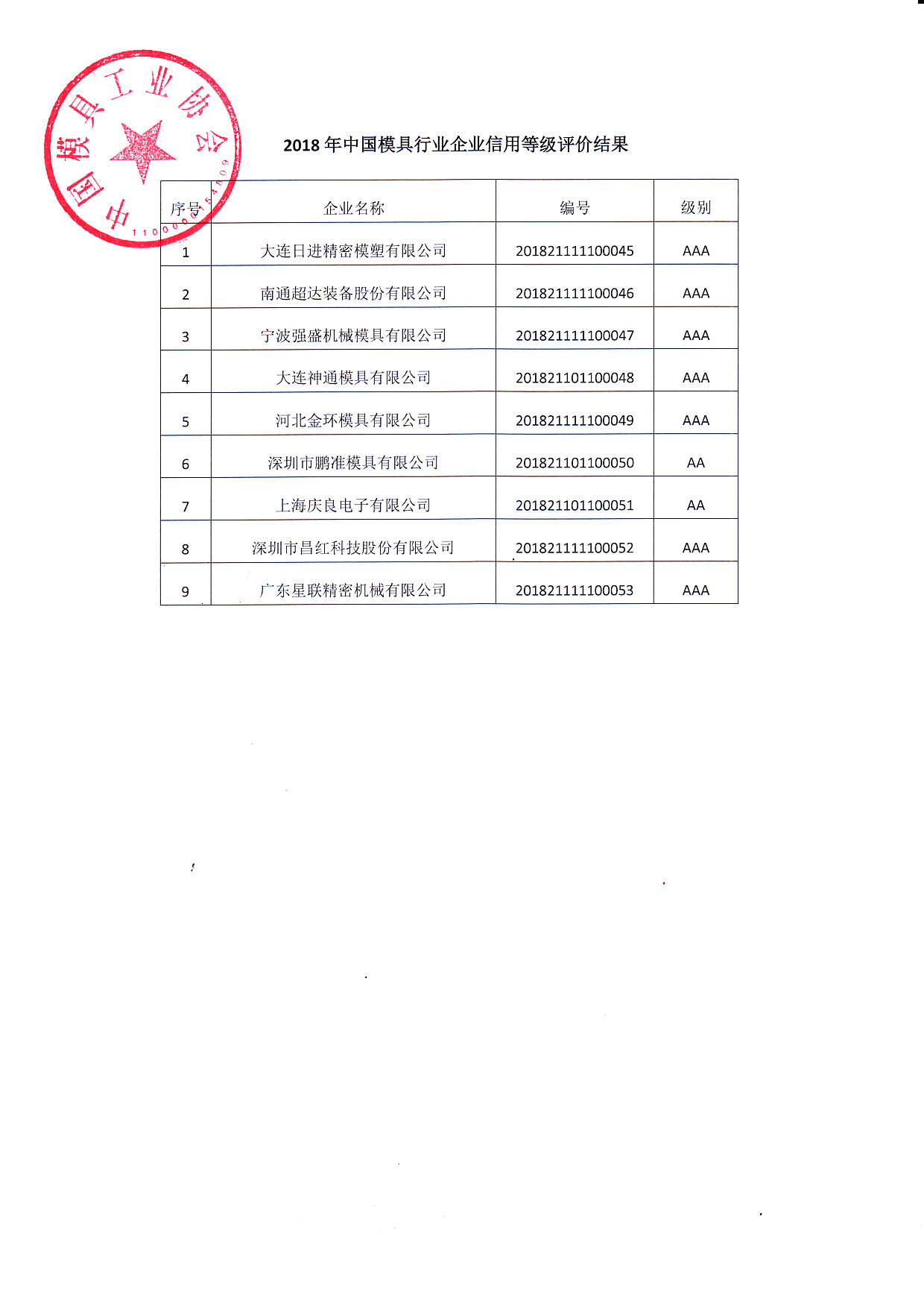 關于對“2018年中國模具行業企業信用等級評價結果”進行公示的公告