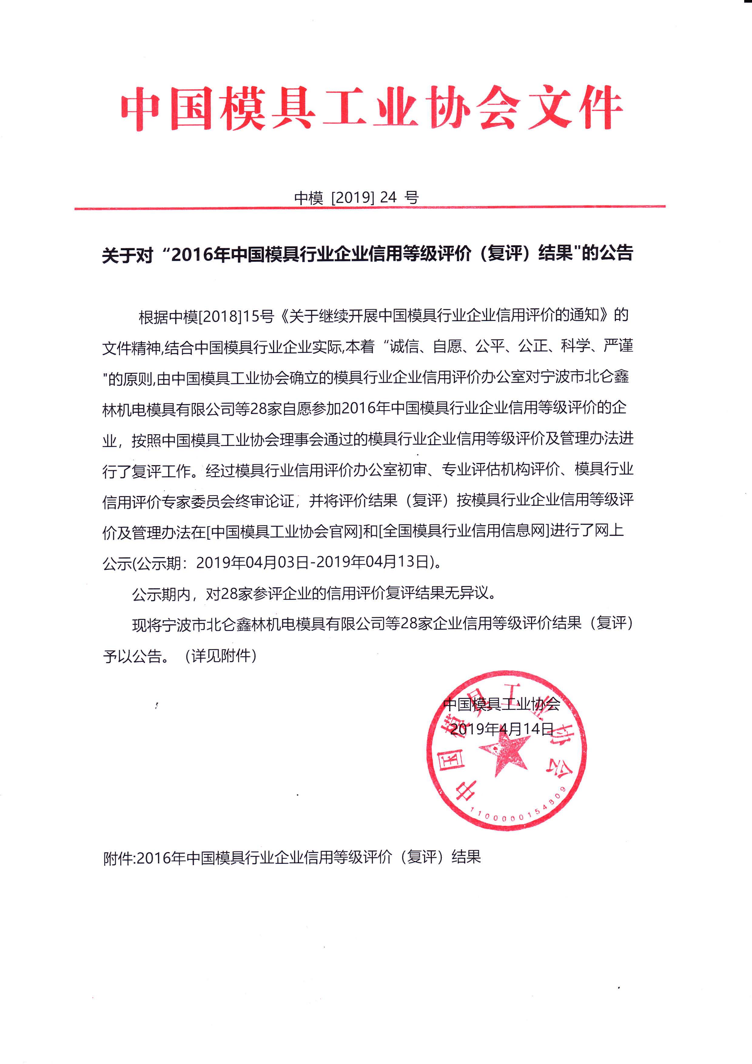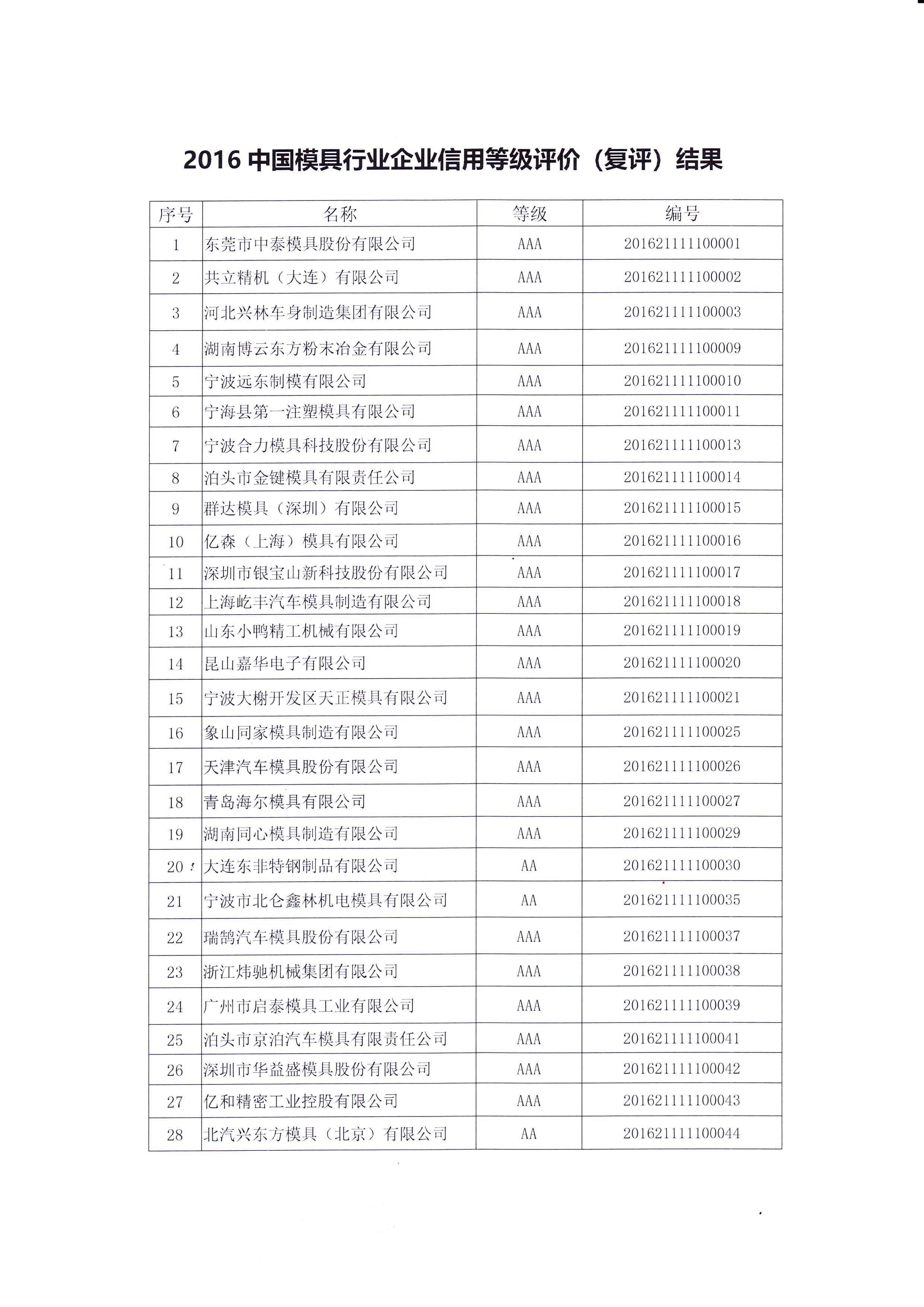 關(guān)于對“2016年中國模具行業(yè)企業(yè)信用等級評價(復(fù)評)結(jié)果”的公告