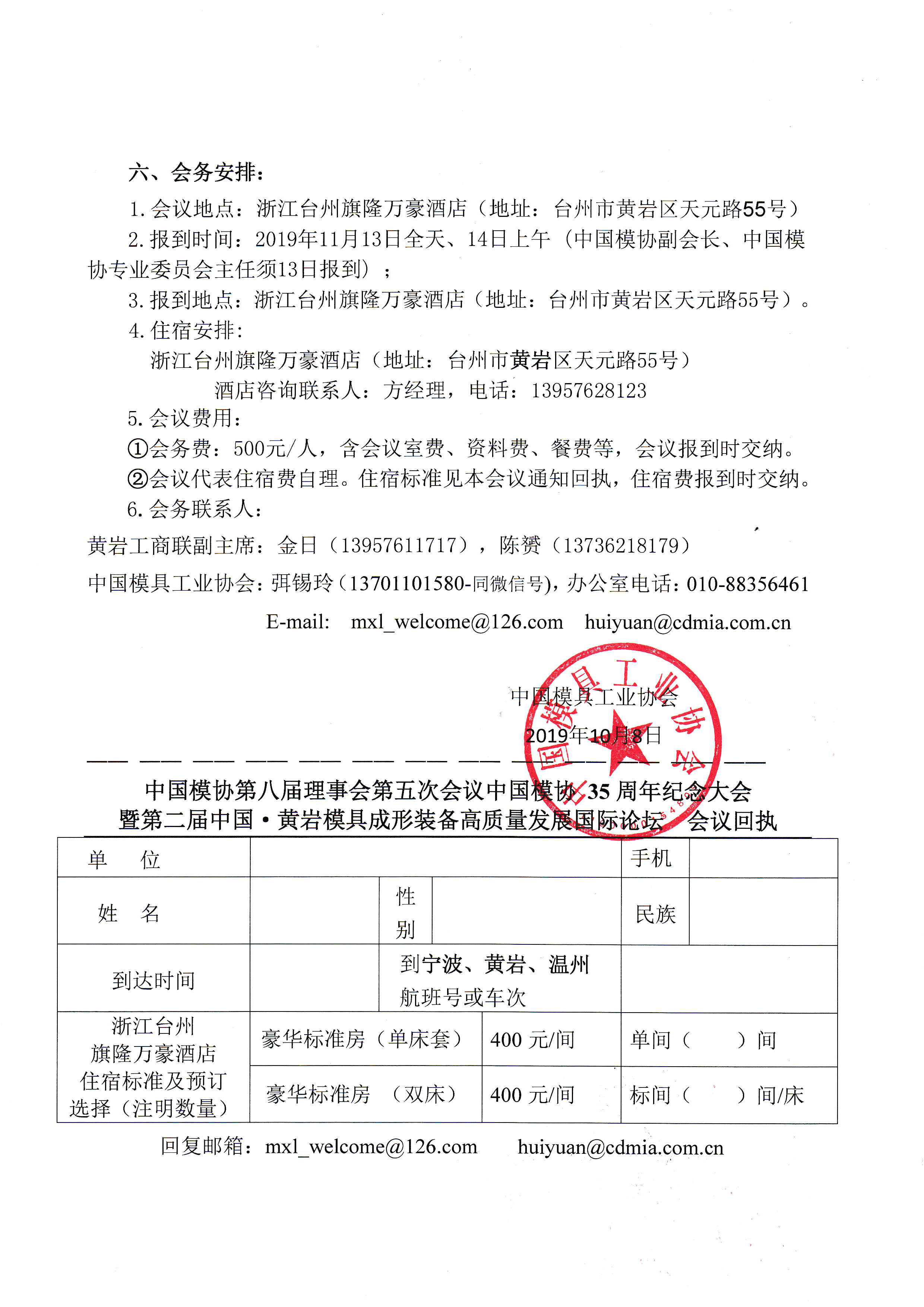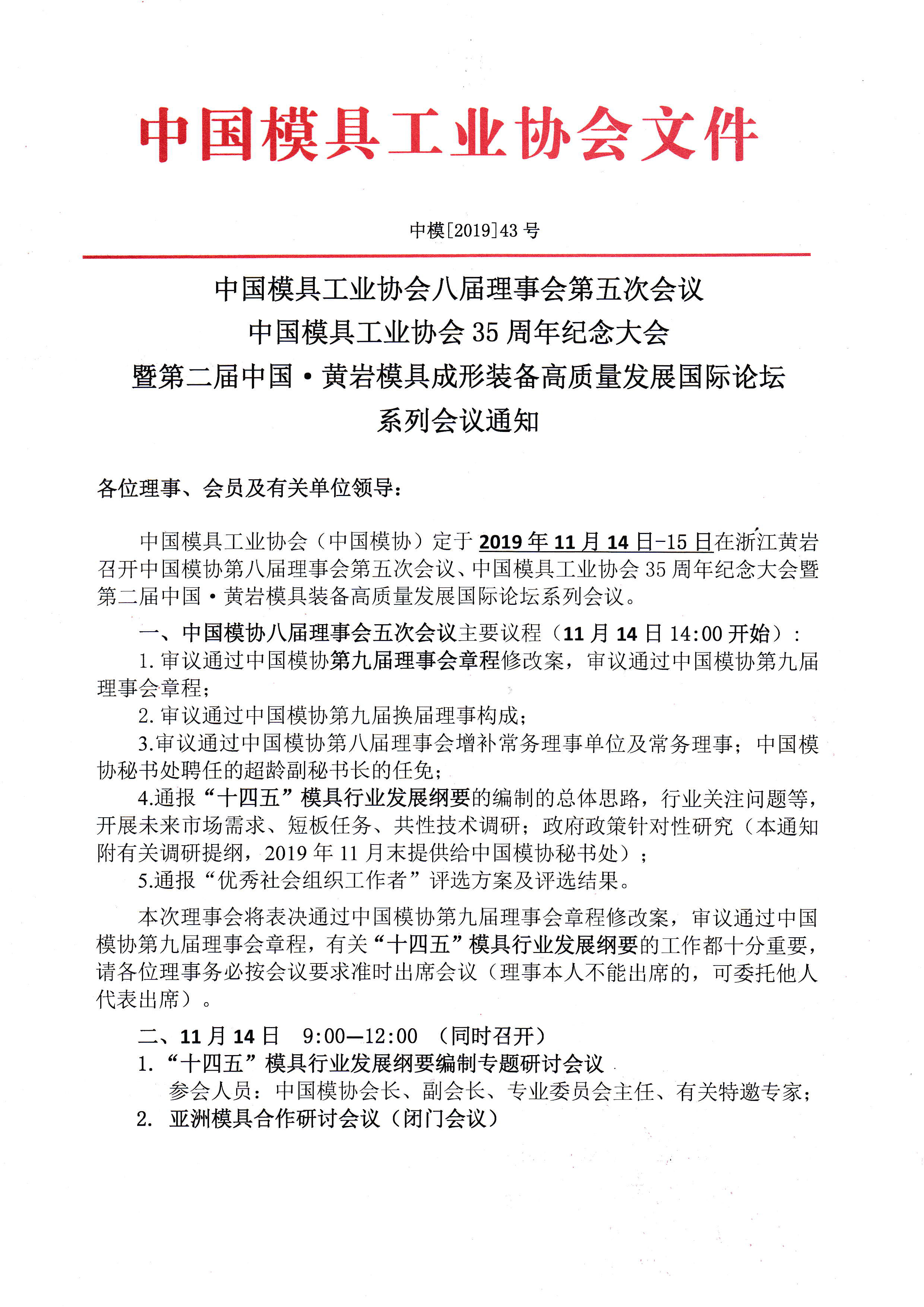 中國模具工業(yè)協(xié)會八屆理事會第五次會議 中國模具工業(yè)協(xié)會35周年紀念大會暨第二屆中國黃巖模具裝備高質量發(fā)展國際論壇系列會議通知