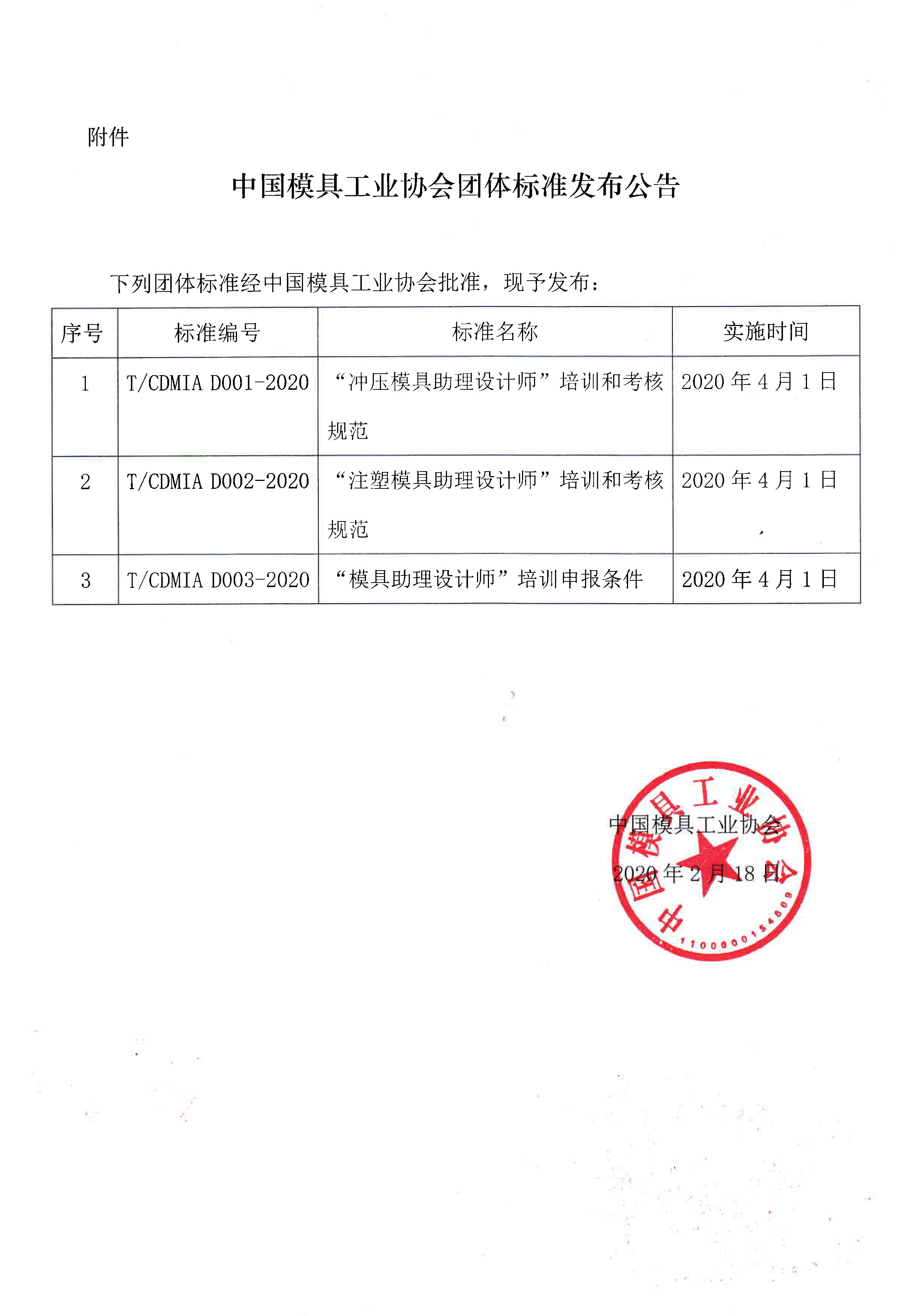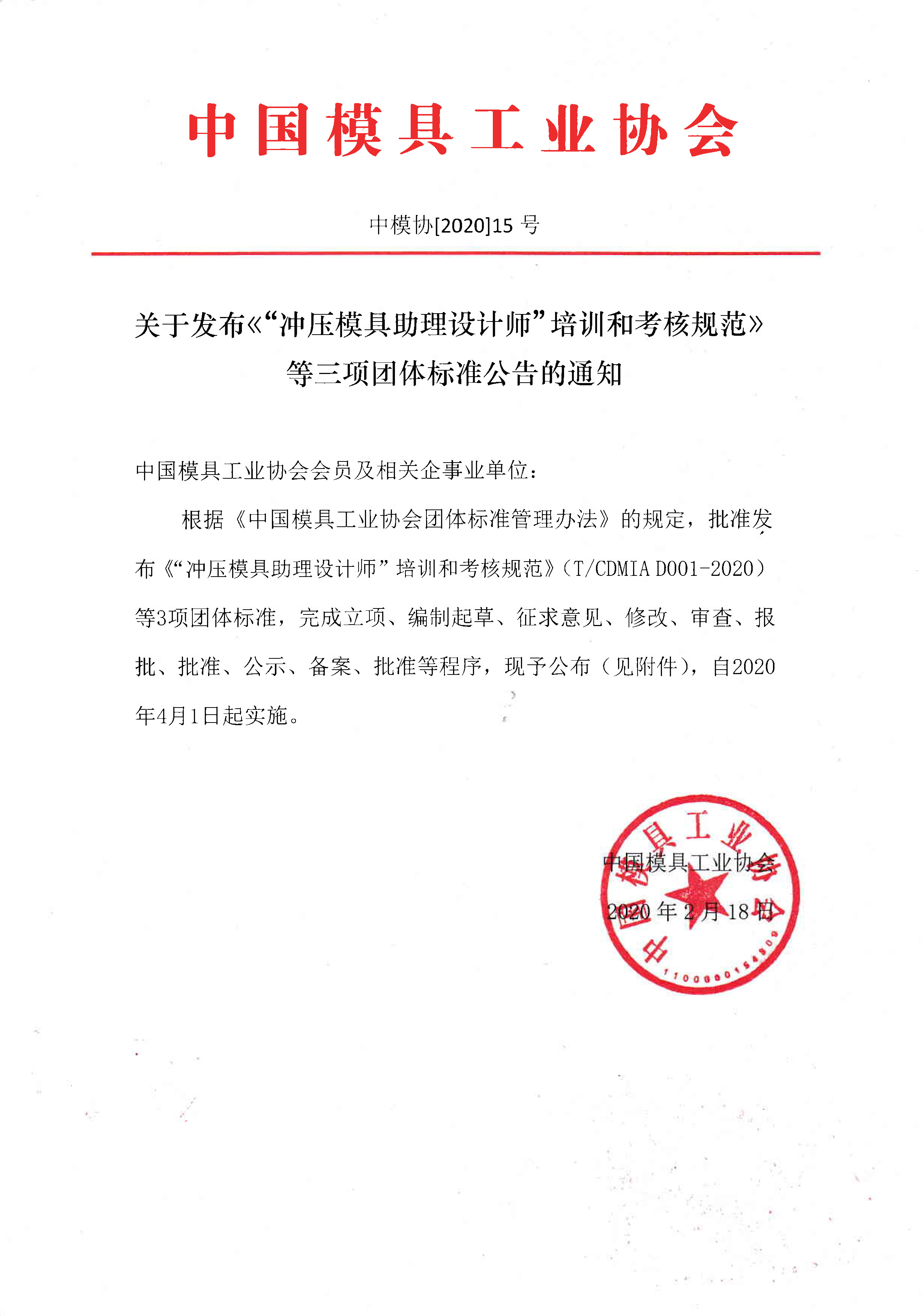 關于發布《“沖壓模具助理設計師”培訓和考核規范》等三項團體標準公告的通知