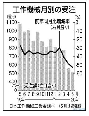 同一日,日本機床工業會(日工會)也公布了5月份的機床訂單實績(速報值)為512億6000萬日元,與去年同期相比減少了52.8%,連續20個月低于去年同期。隨著新型冠狀病毒疫情影響的擴大,客戶的設備投資紛紛擱置,營業活動也受到了自肅的影響,內需和外需都大幅下降。總額與外需都是2009年11月以來的最低水平。單月的總額也連續2個月低于600億日元。