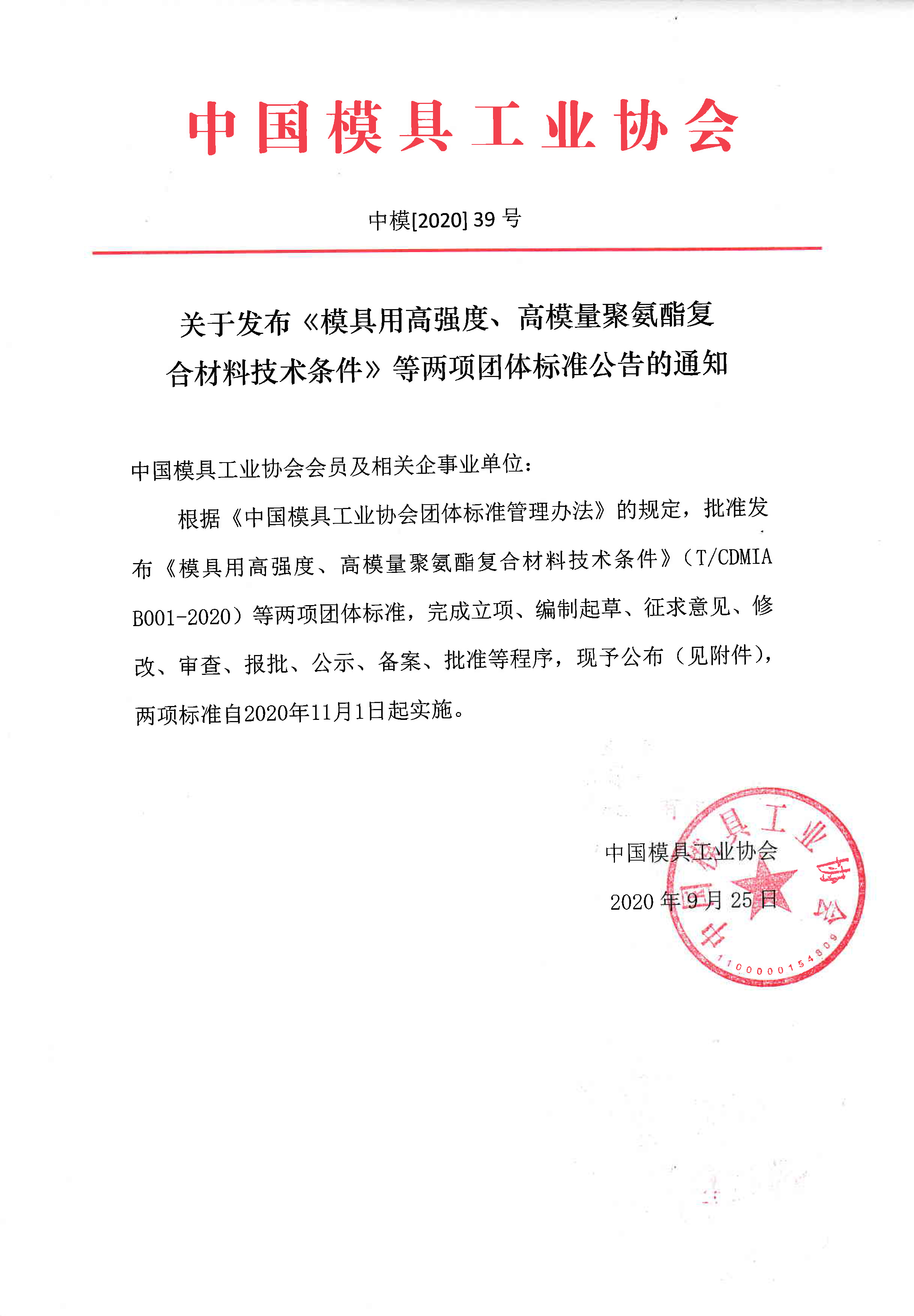 關于發布《模具用高強度、高模量聚氨酯復合材料技術條件》等兩項團體標準公告的通知