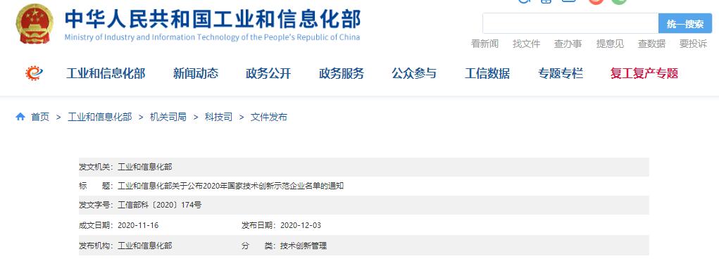 關于公布2020年國家技術創(chuàng)新示范企業(yè)名單的通知