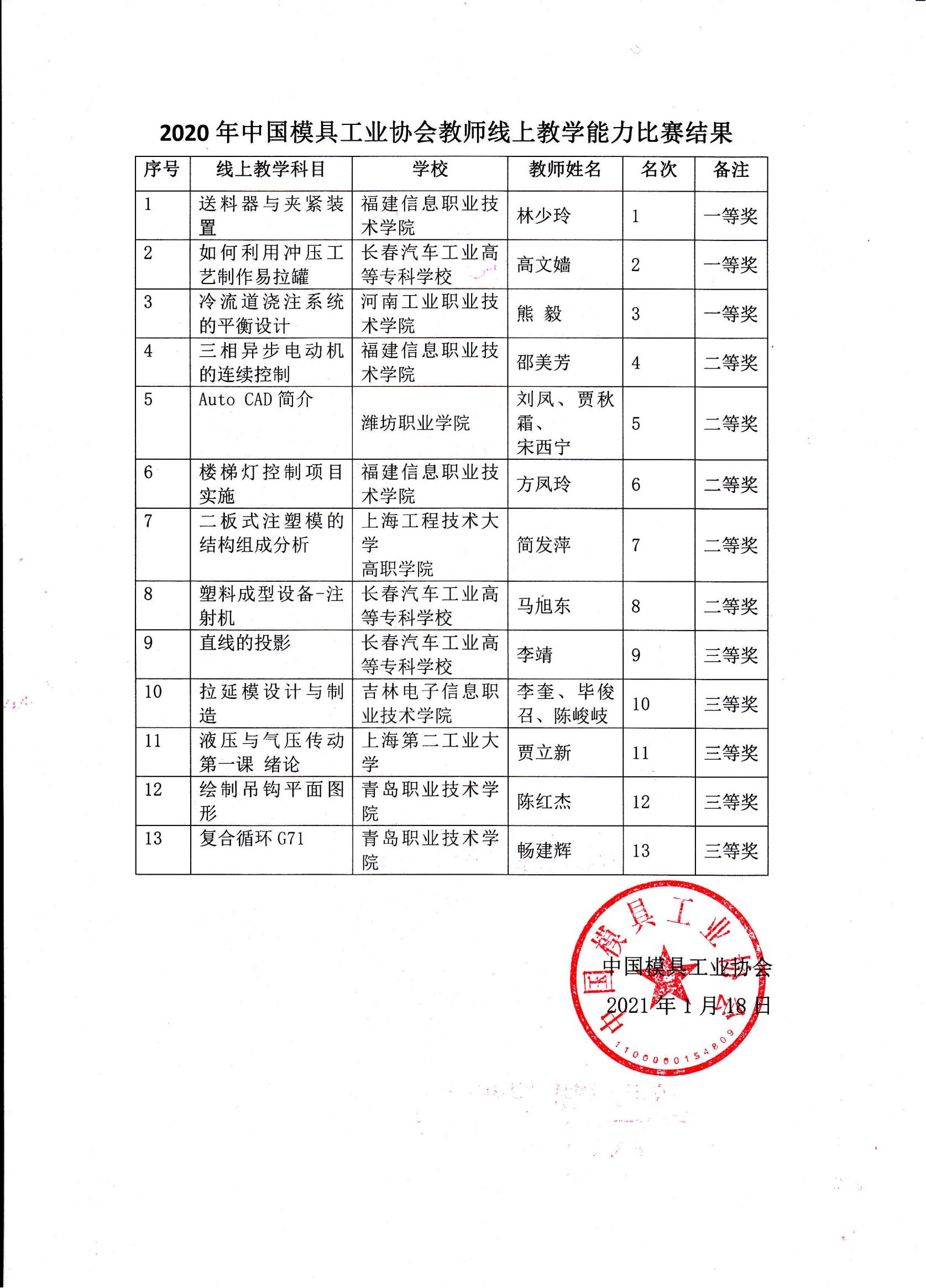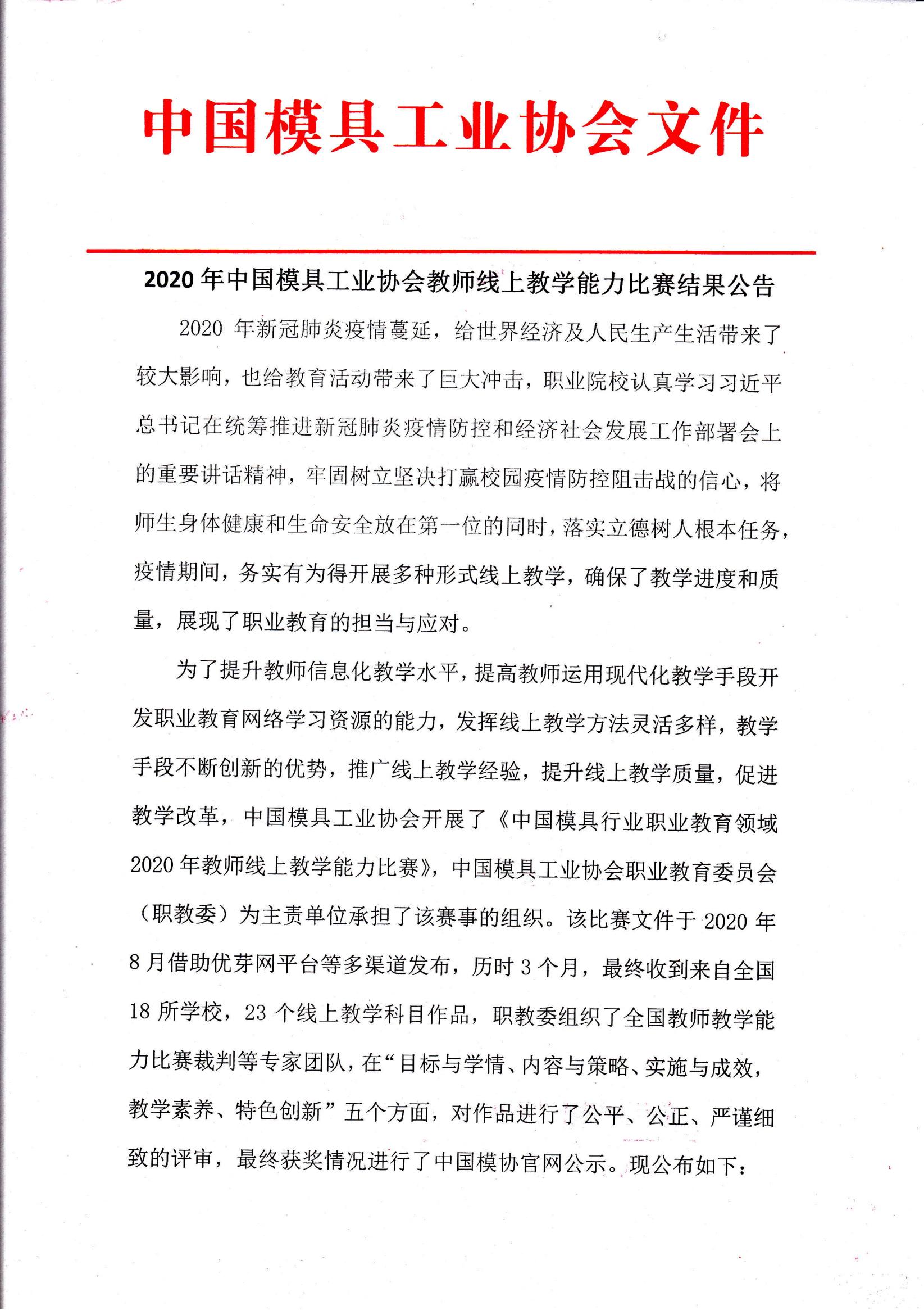 2020年中國(guó)模具工業(yè)協(xié)會(huì)教師線上教學(xué)能力比賽結(jié)果公告