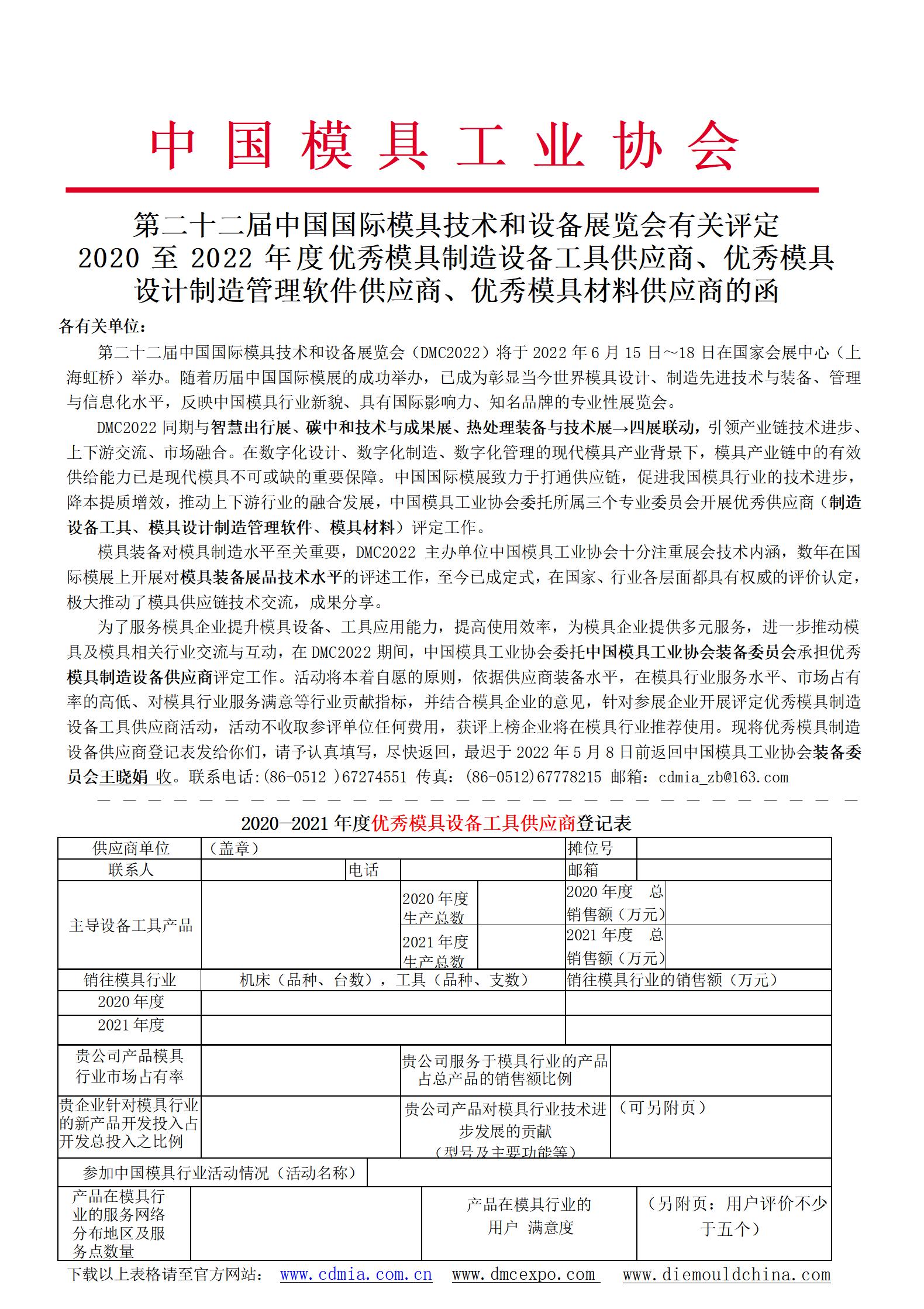 第二十二屆中國國際模具技術和設備展覽會有關評定 2020至2022年度優秀模具制造設備工具供應商、優秀模具設計制造管理軟件供應商、優秀模具材料供應商的函