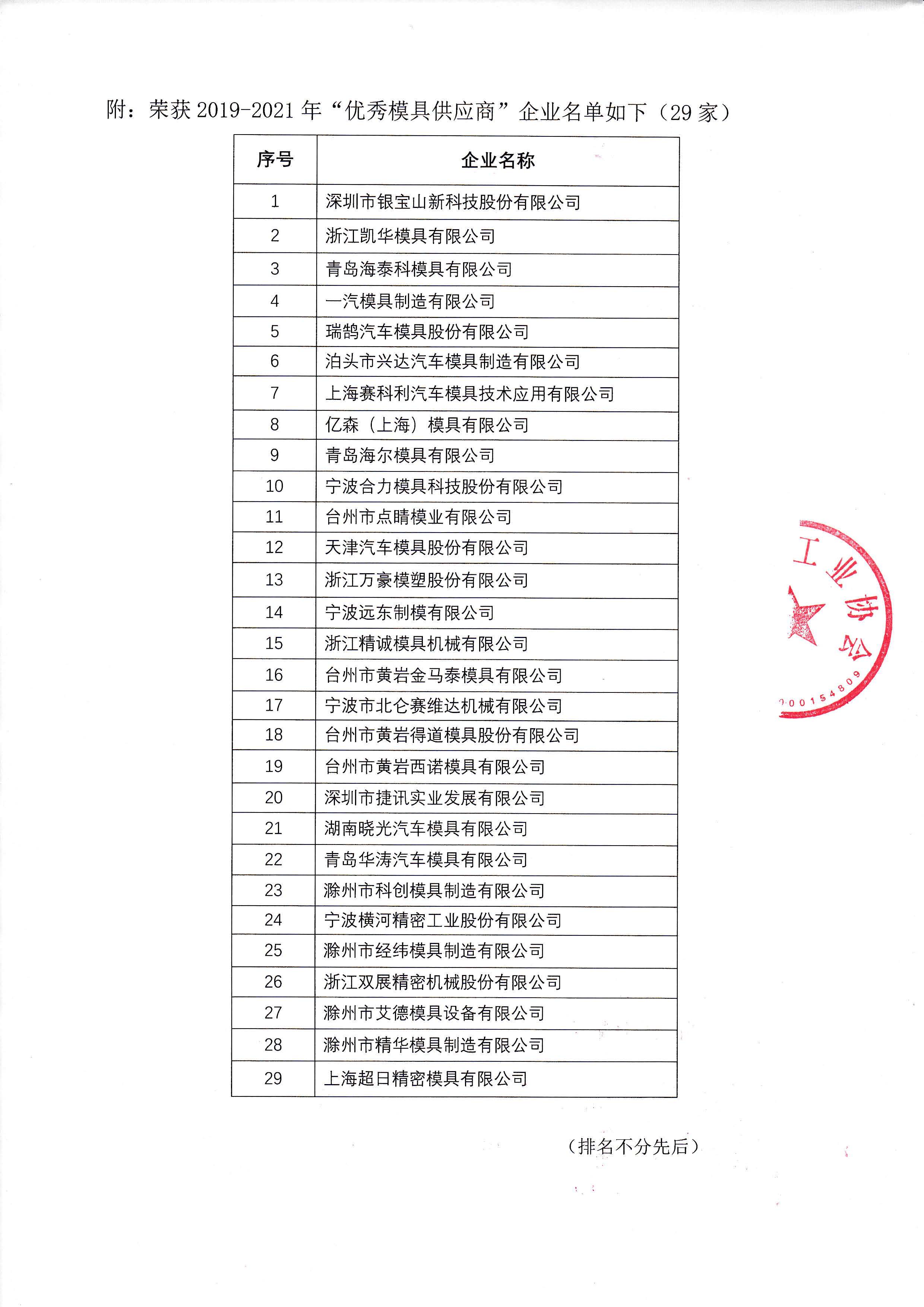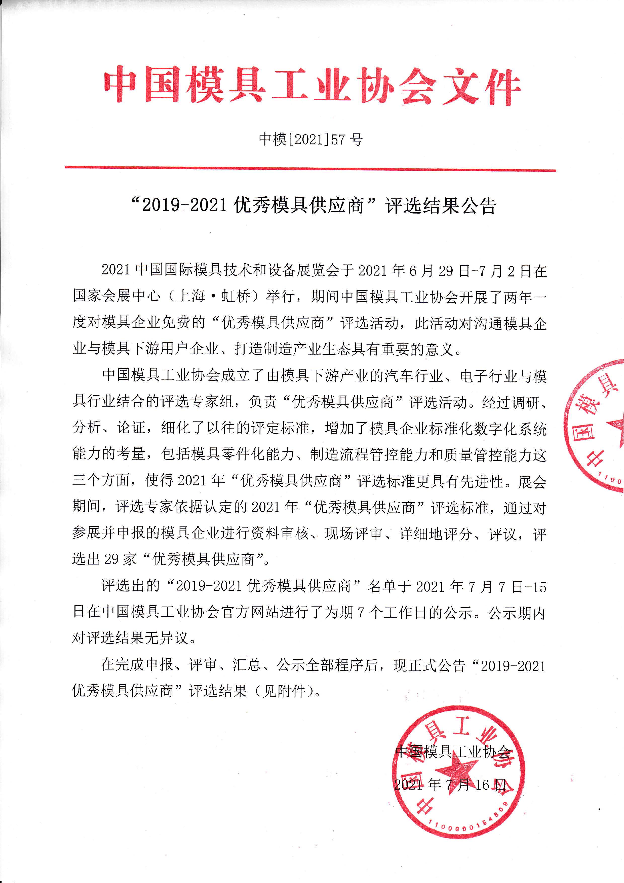 “2019-2021優(yōu)秀模具供應(yīng)商”評(píng)選結(jié)果公告