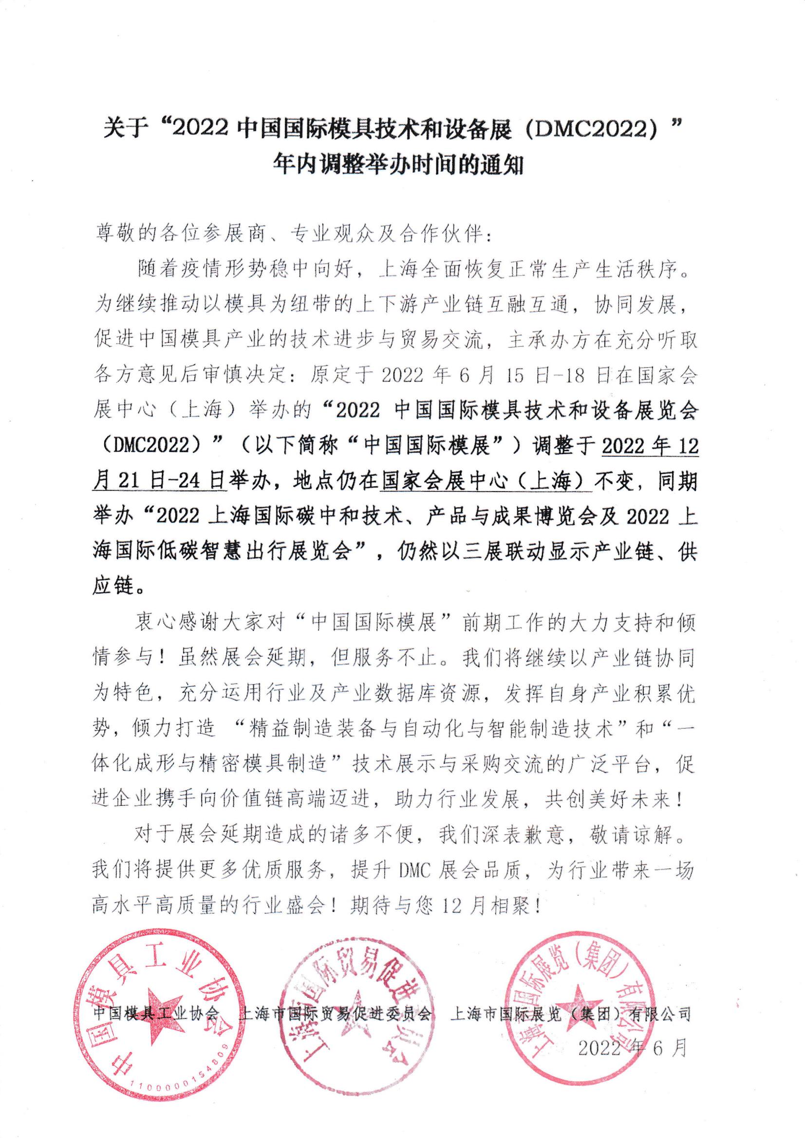 關于“2022中國國際模具技術和設備展(DMC2022)年內調整舉辦時間的通知”
