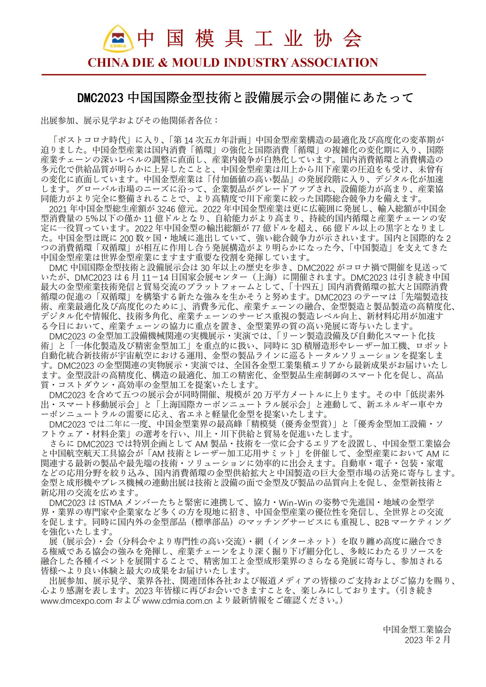 DMC2023 中國(guó)國(guó)際金型技術(shù)と設(shè)備展示會(huì)の開催にあたって