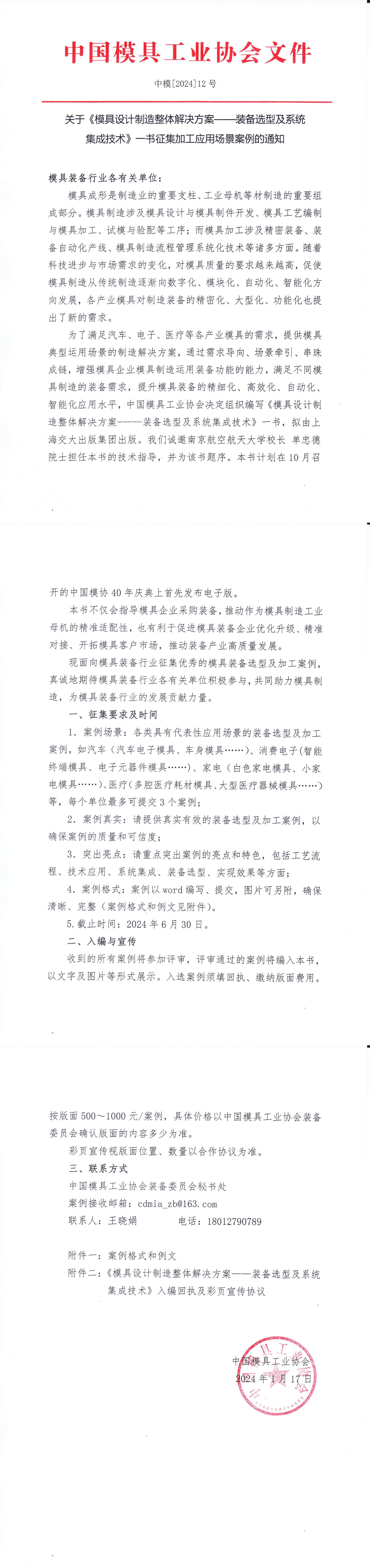 關(guān)于《模具設(shè)計制造整體解決方案——裝備選型及系統(tǒng)集成技術(shù)》一書征集加工應(yīng)用場景案例的通知