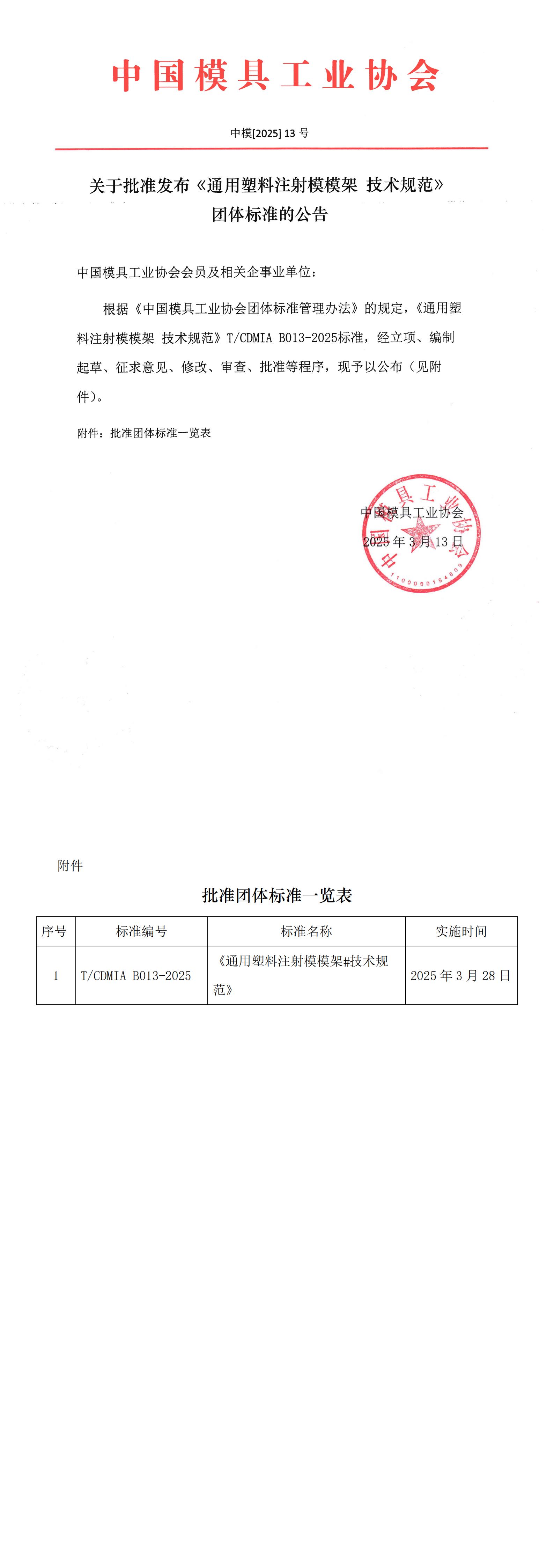 關(guān)于批準(zhǔn)發(fā)布《通用塑料注射模模架 技術(shù)規(guī)范》團(tuán)體標(biāo)準(zhǔn)的公告
